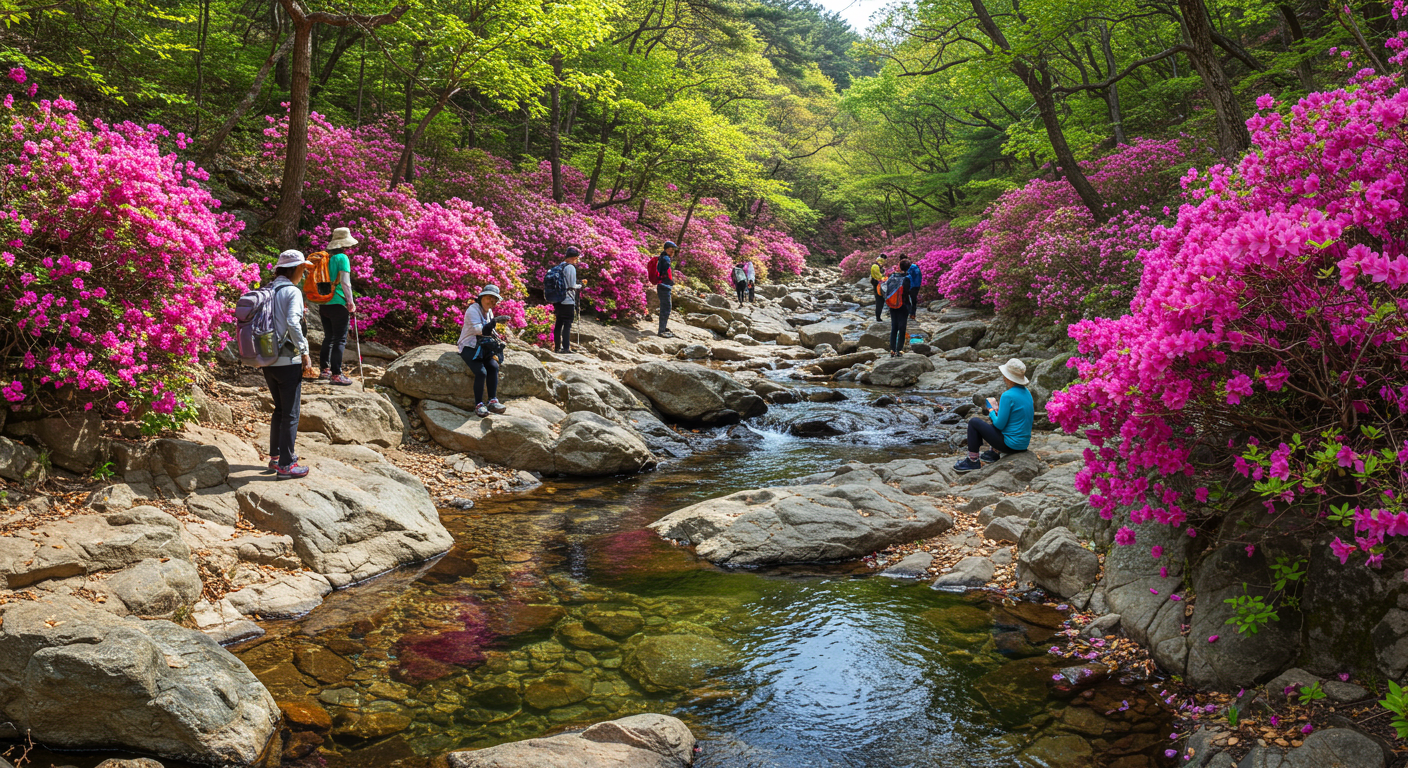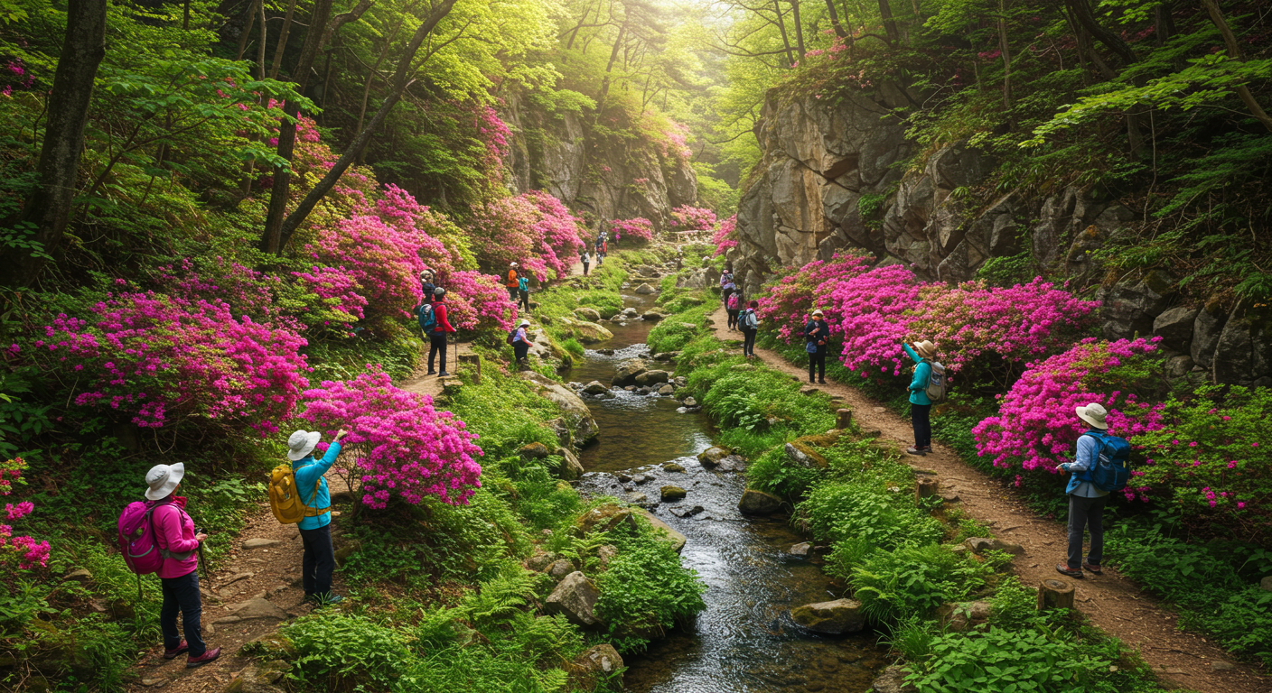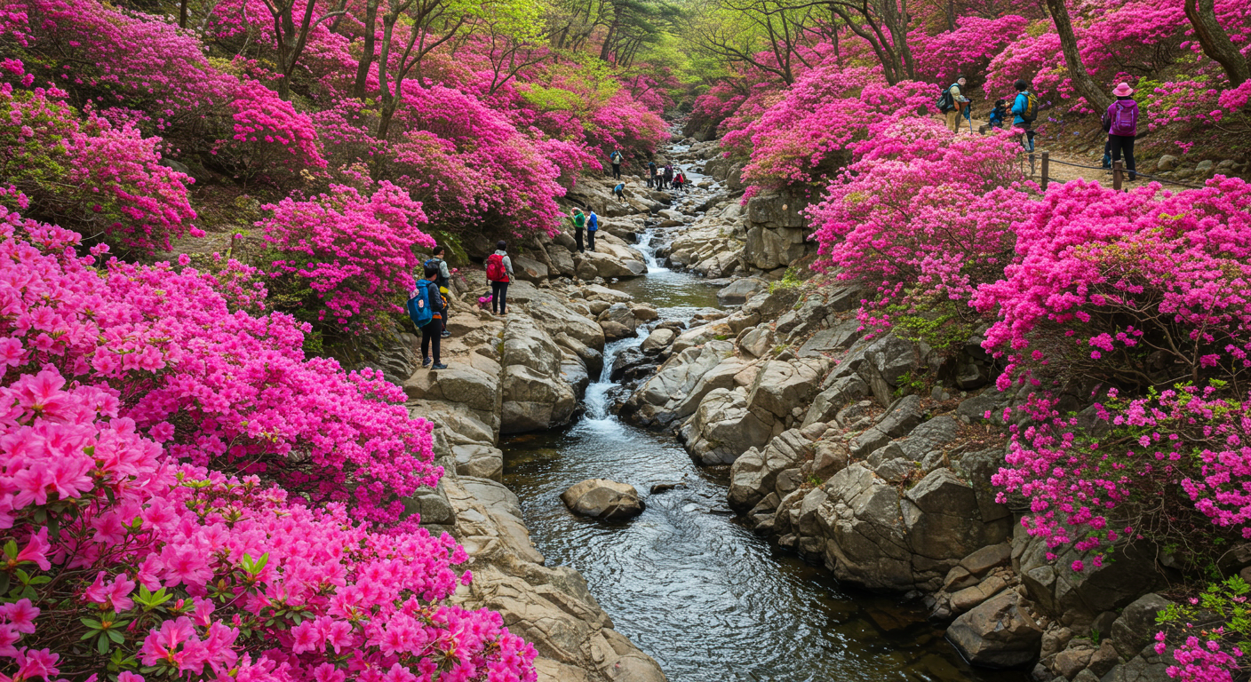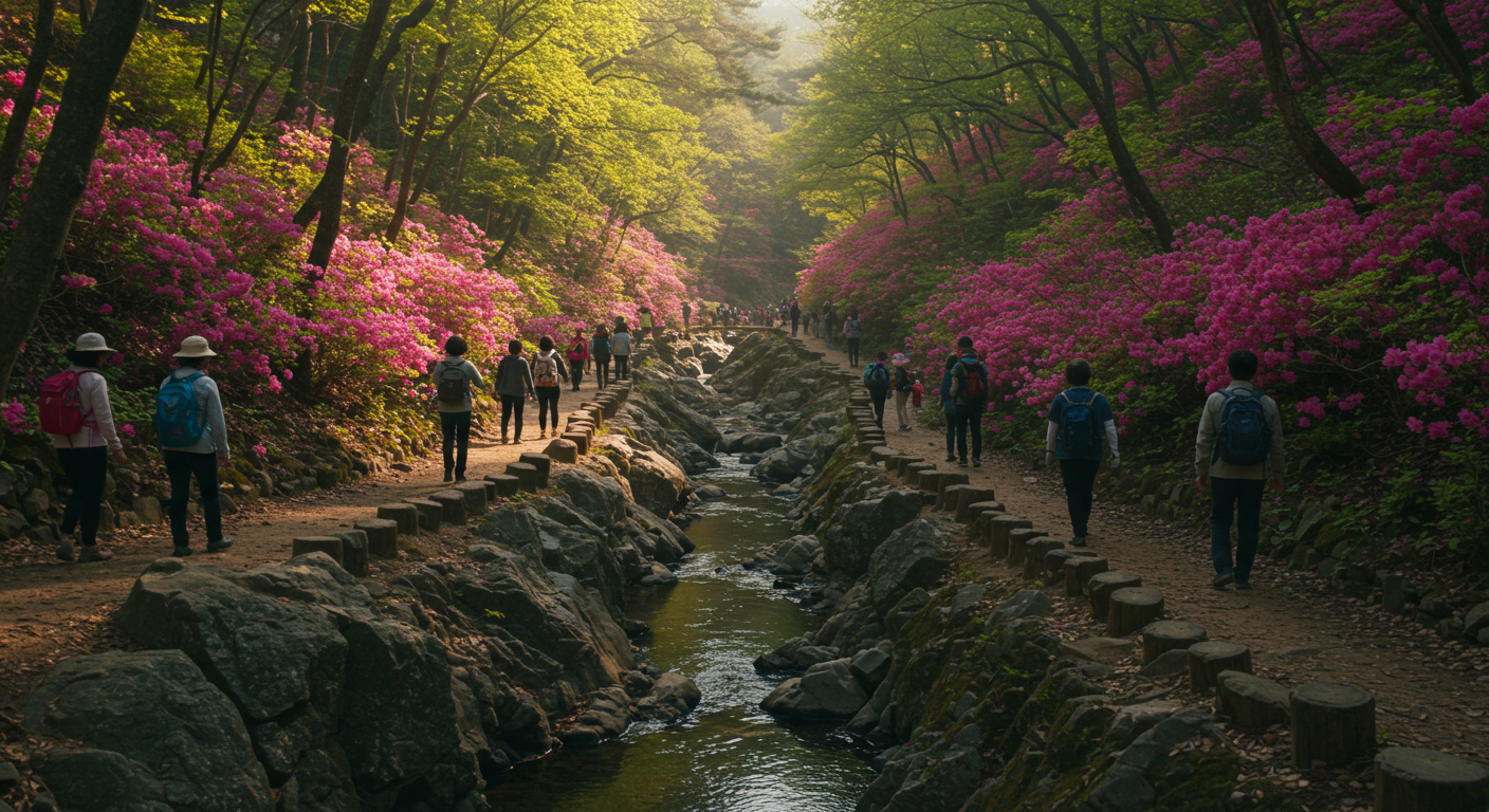 특히 봄철에 이 코스는 출발 지점에서 벚나무 가로수길이 뒤덮여 있고, 가는 길 곳곳에 진달래와 철쭉이 뒤덮여 장관을 이룹니다. 봄의 화사함을 온몸으로 느낄 수 있는 최고의 봄여행지예요!