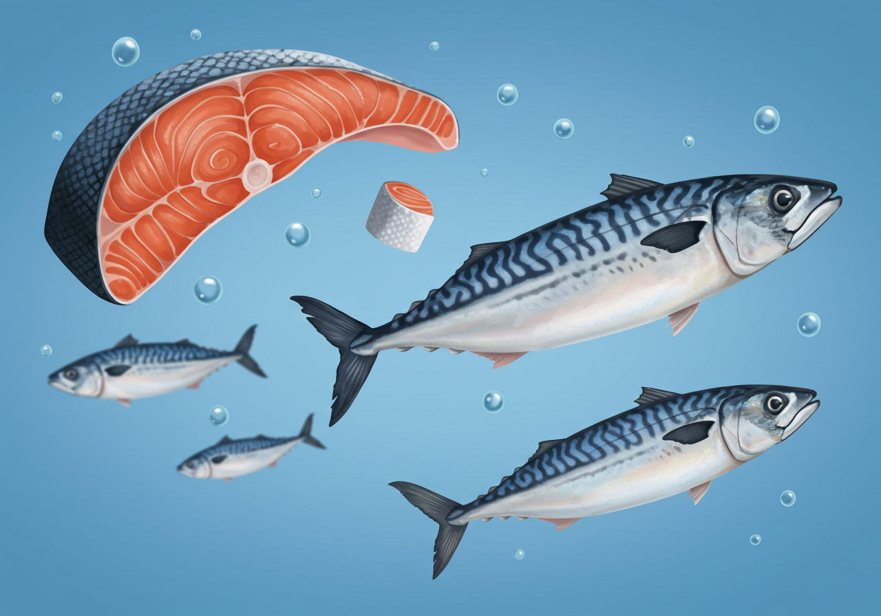 - EPA, DHA : 주로 생선류(고등어, 연어, 청어) 등에 풍부하며, 심혈관계 건강과 두뇌 기능에 중요