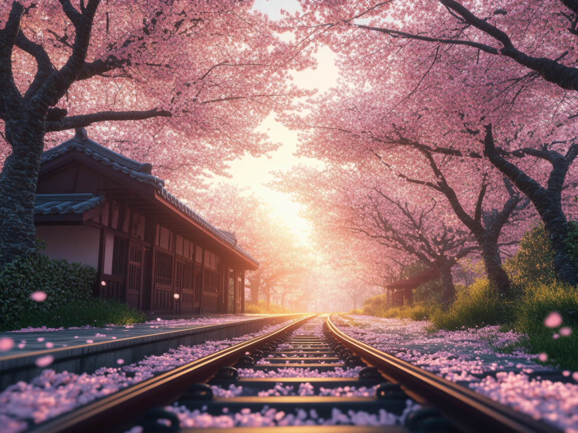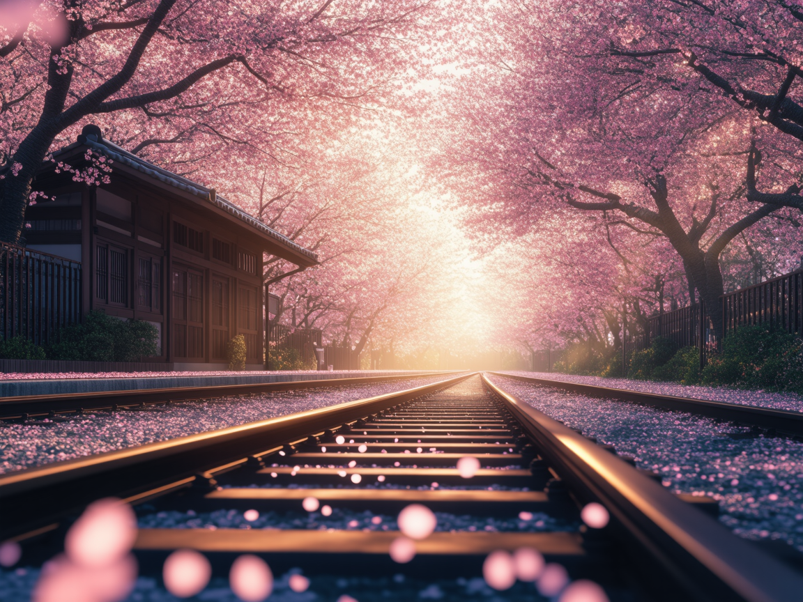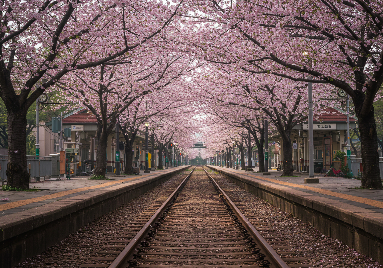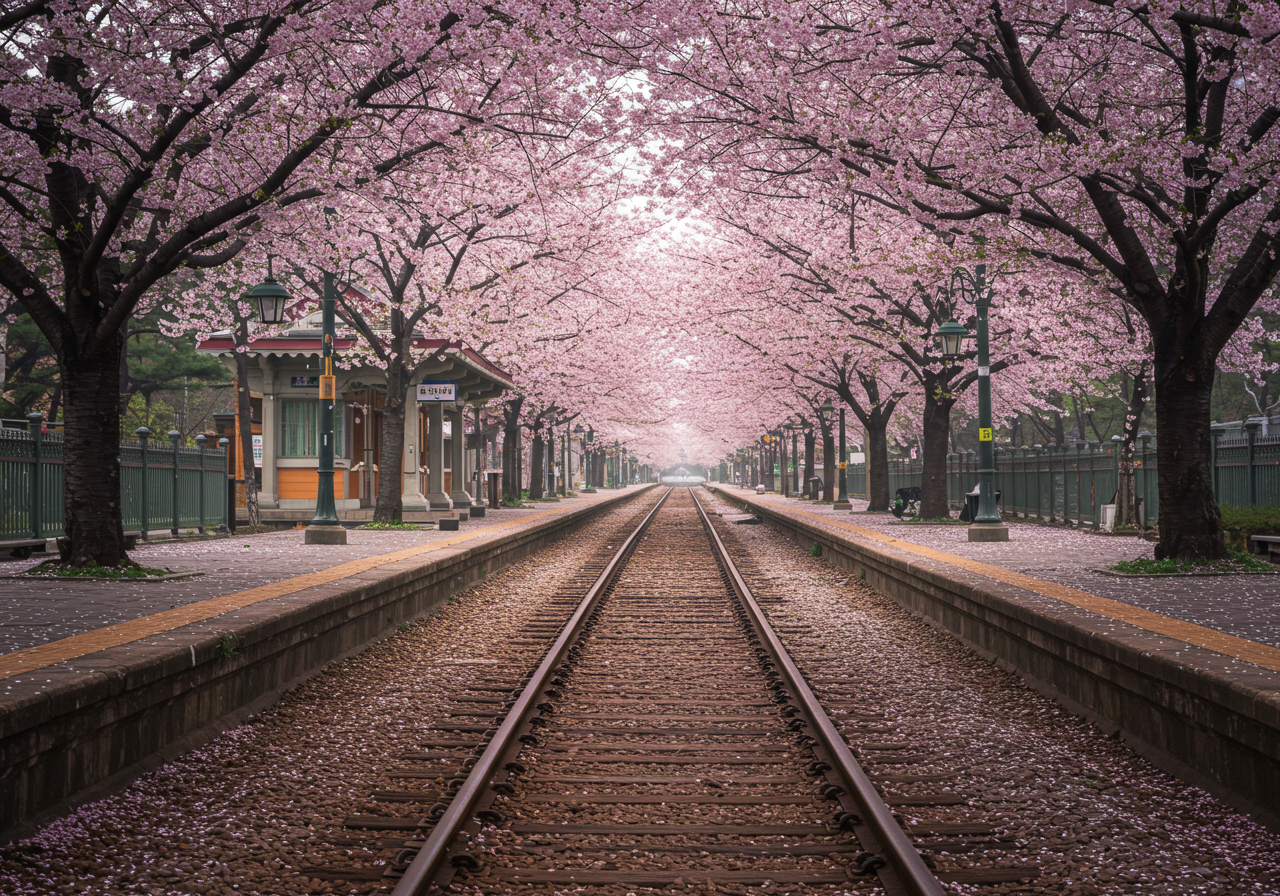 은은한 봄바람이 불어오는 철로 위에서 벚꽃이 흩날리는 순간은 꼭 한 번 경험해 보아야 할 장면입니다.