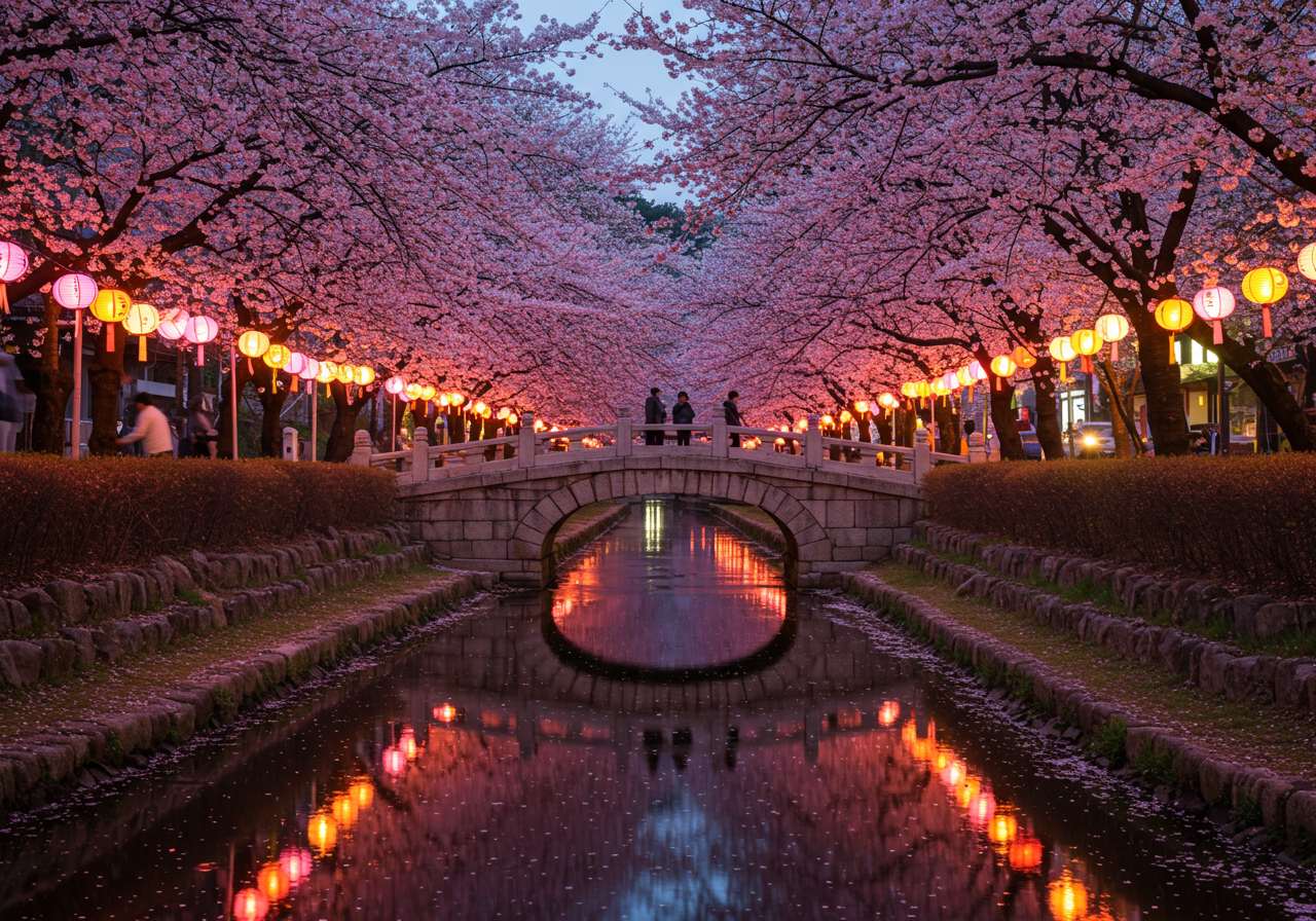 특히, 해가 질 무렵 도는 불빛과 벚꽃이 어우러져 낭만적인 분위기를 더합니다.